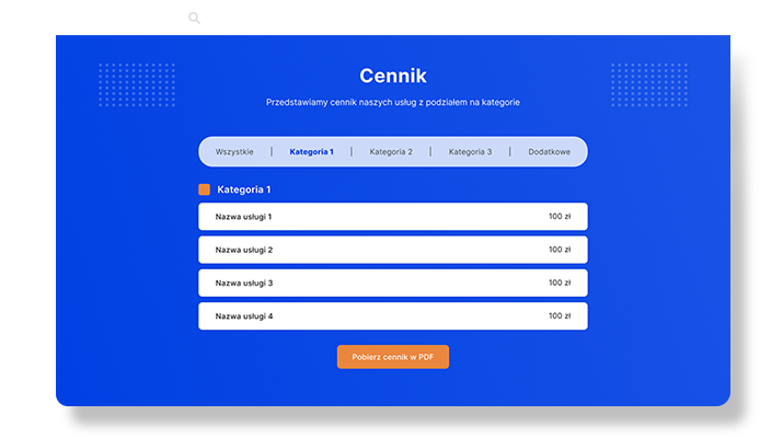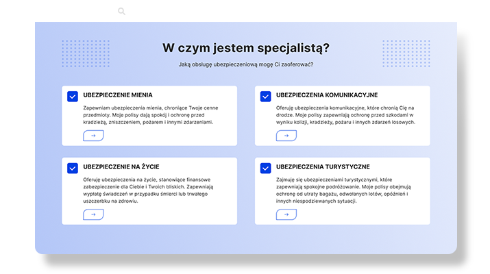 Krótkie i przejrzyste przedstawienie zakresu Twoich usług lub specjalizacji. Wyróżnij usługi, ,które chcesz przedstawić swoim klientom