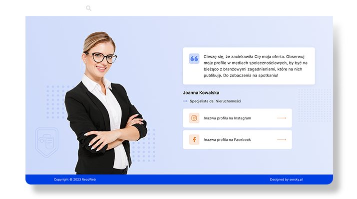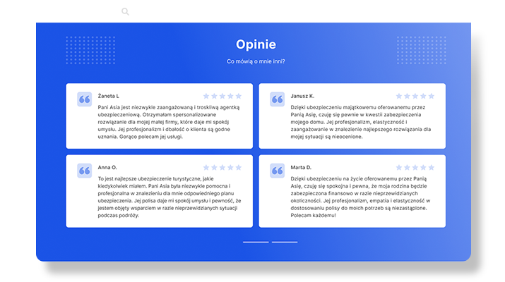 Jeśli jesteś ekspertem w swojej dziedzinie i chcesz pokazać swoje umiejętności oraz doświadczenie klientom, strona rekomendacyjna będzie idealnym rozwiązaniem. Dzięki niej wyróżnisz się na rynku, prezentując swoją osobę, referencje i historie zadowolonych klientów.