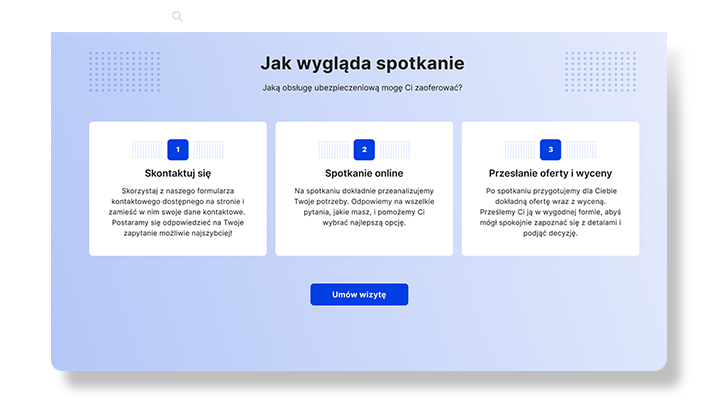 Analiza przeprowadzonego wywiadu Twoich oczekiwań pomoże nam w dobraniu odpowiednich sekcji na stronę rekomendacyjną. Strona rekomendacyjna to gwarancja prostej i efektywnej formy prezentacji Twojej działalności
